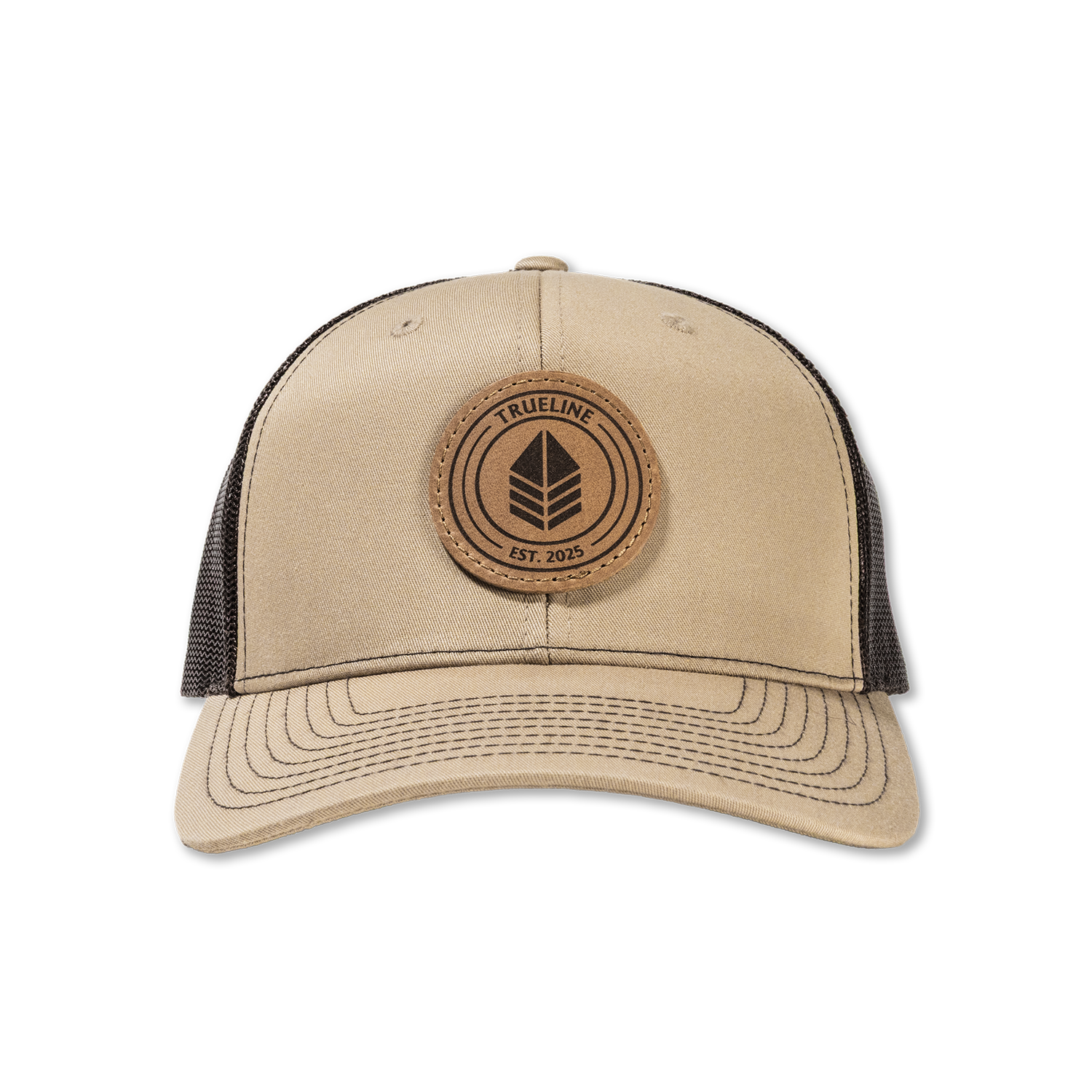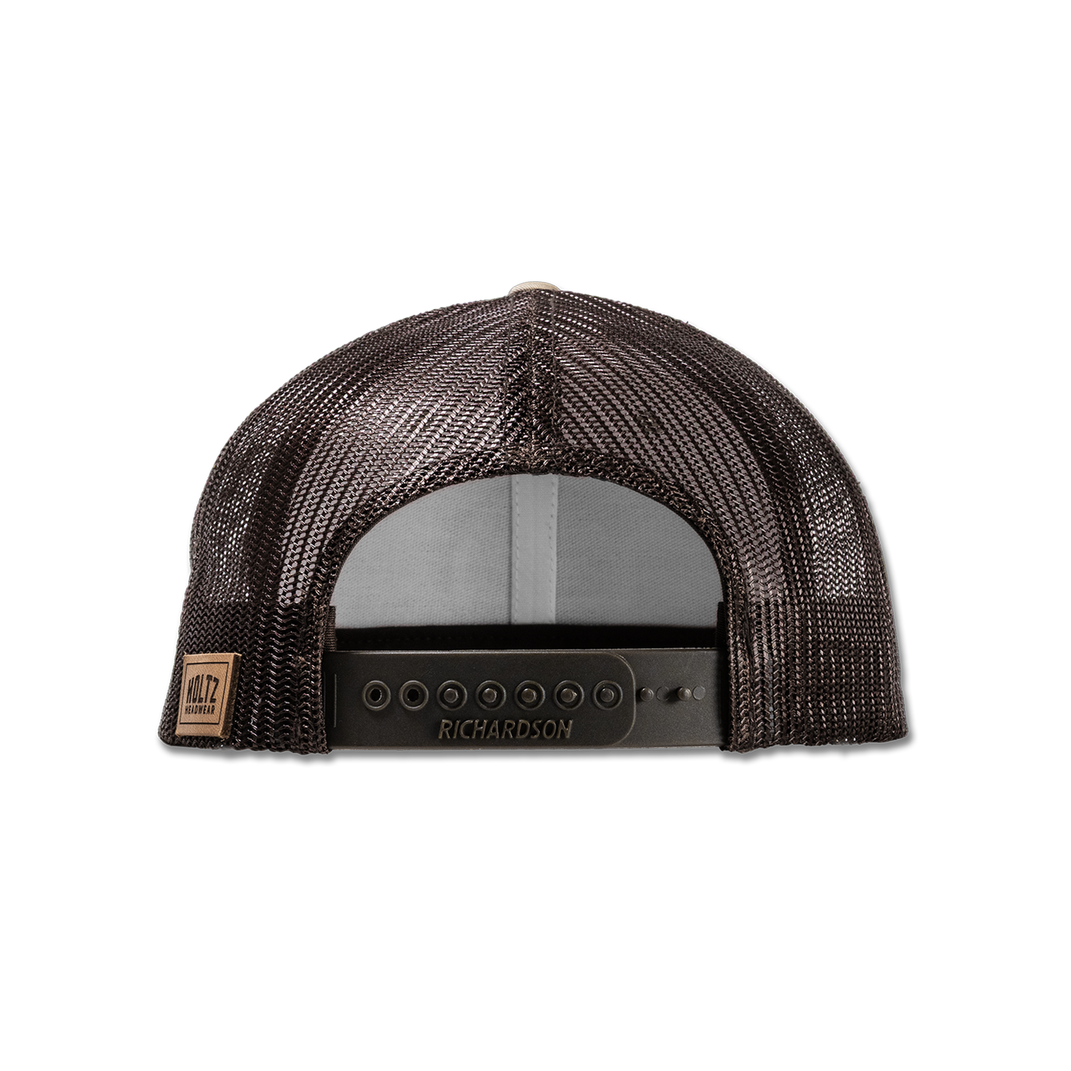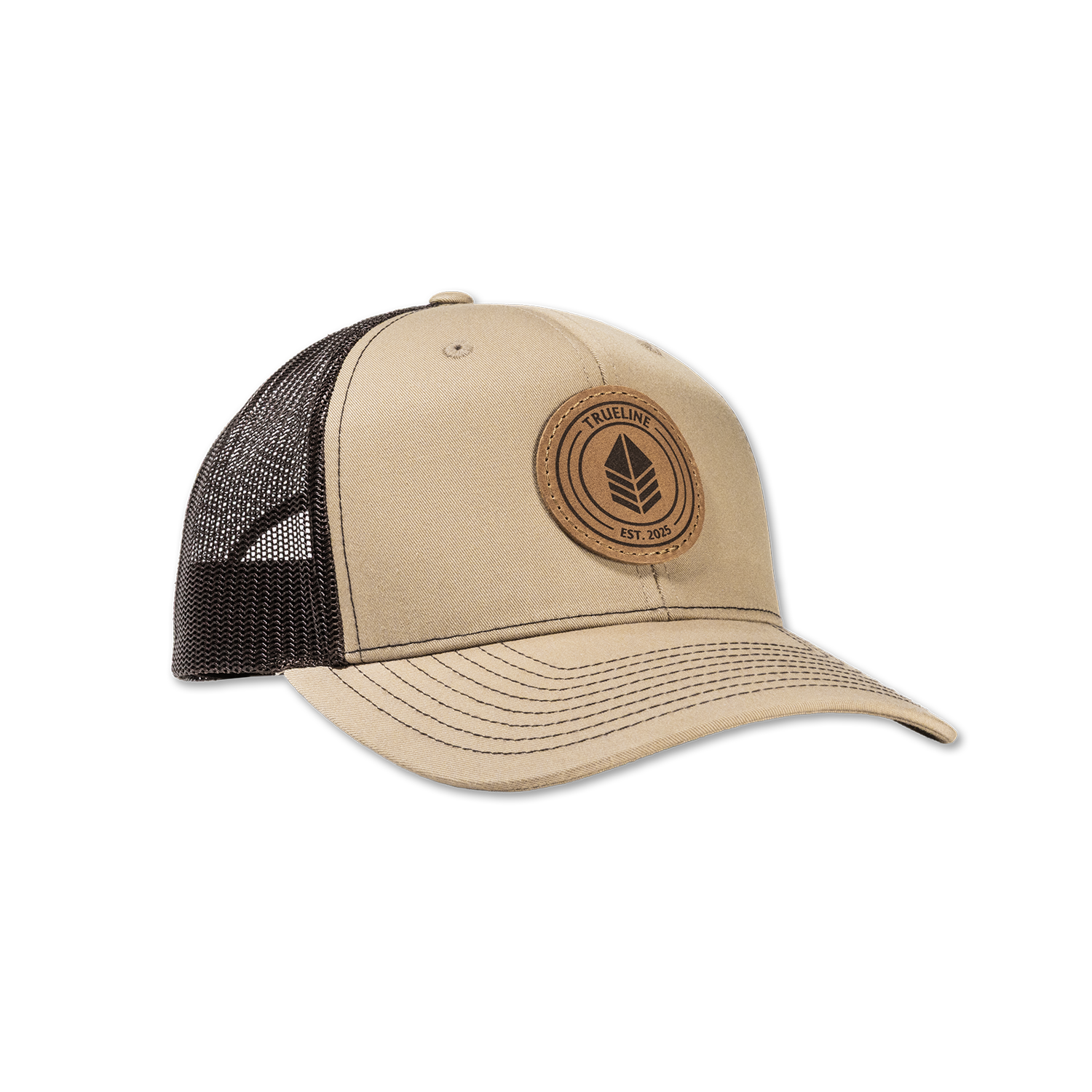 This Trueline Leather Patch Hat is built on the classic Richardson 112 trucker hat, known for its comfortable fit and durable build. It features a khaki cotton front and a breathable coffee-colored mesh back with an adjustable snapback. The leather patch is crafted and installed by Holtz Headwear.